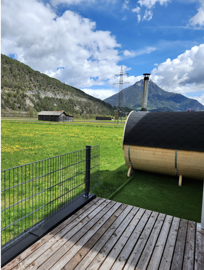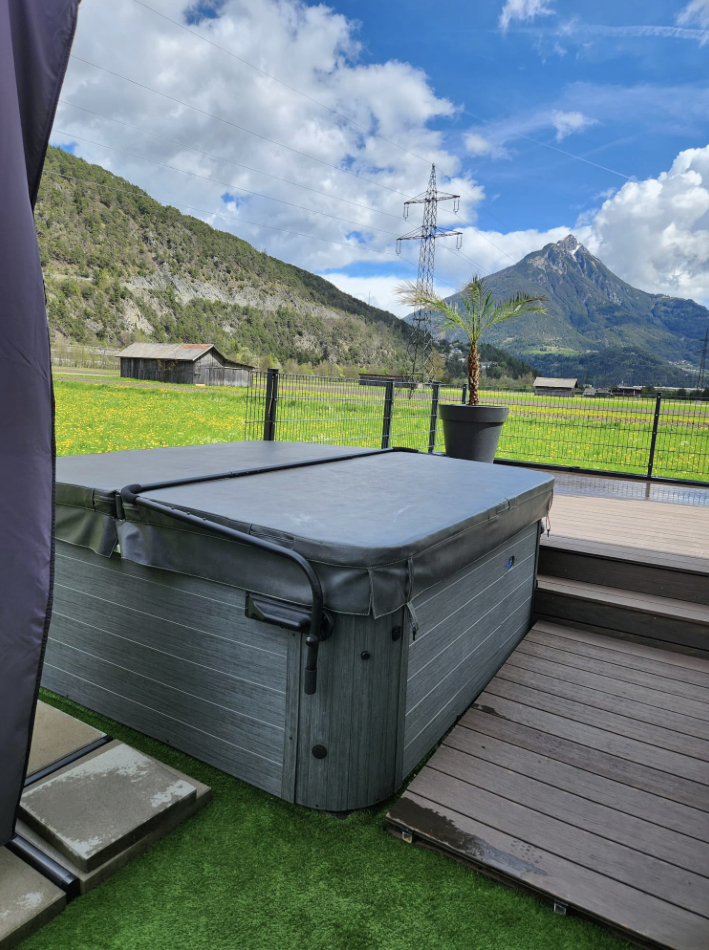 Die Terrasse lädt zum Entspannen ein. Besonders schön: der Whirlpool und die Fasssauna, die sowohl im Sommer als auch im Winter unvergessliche Momente garantieren.