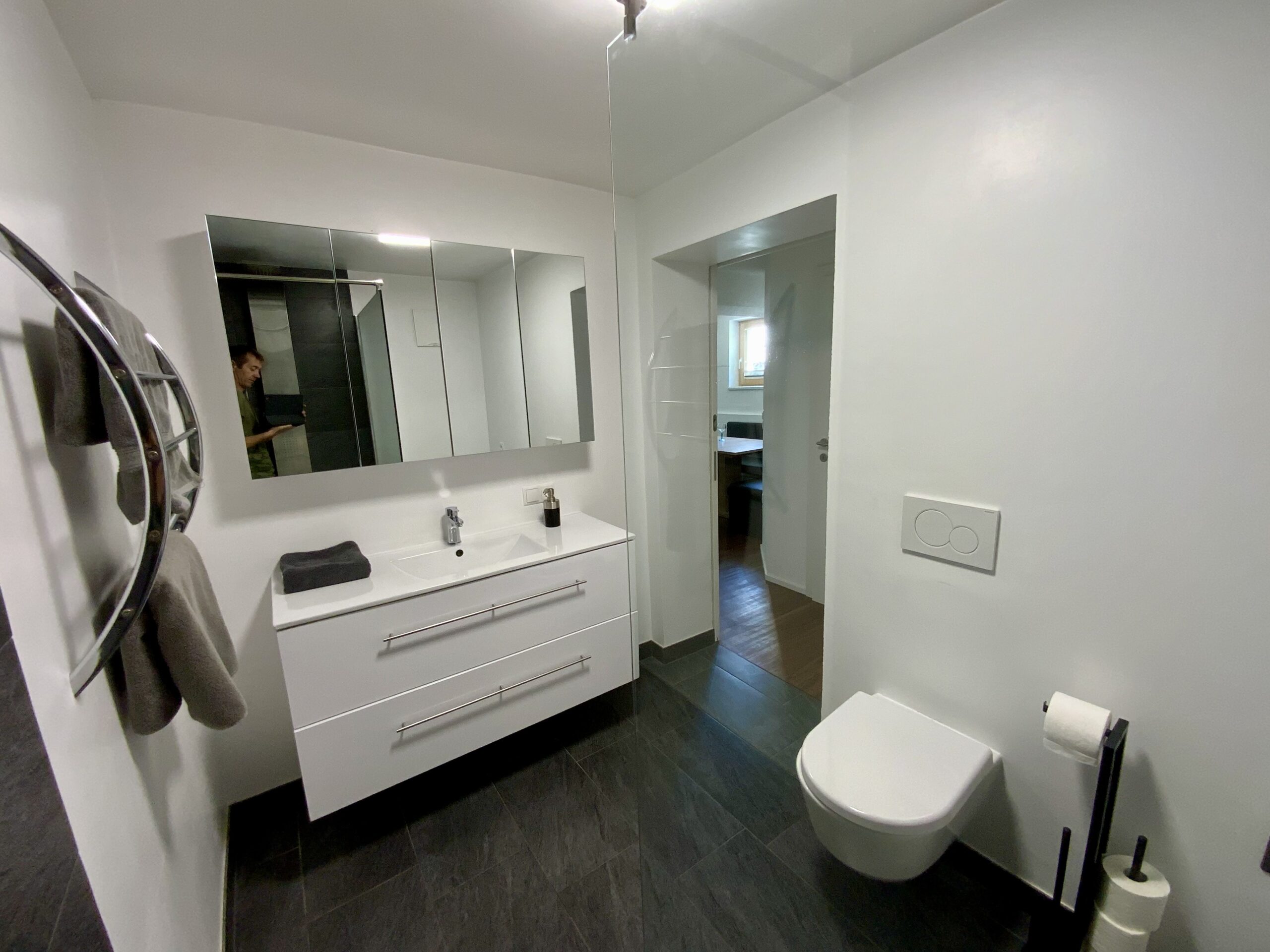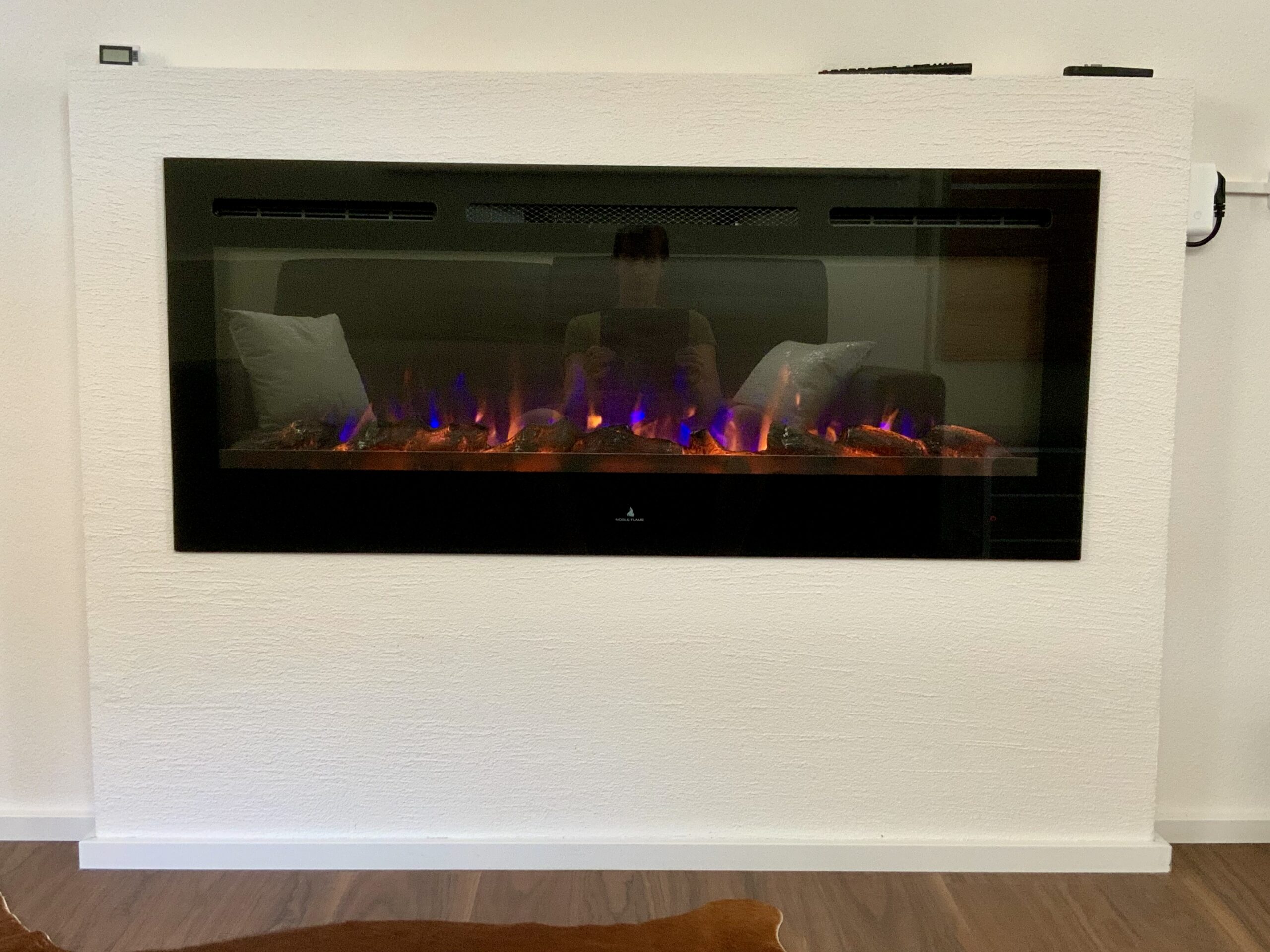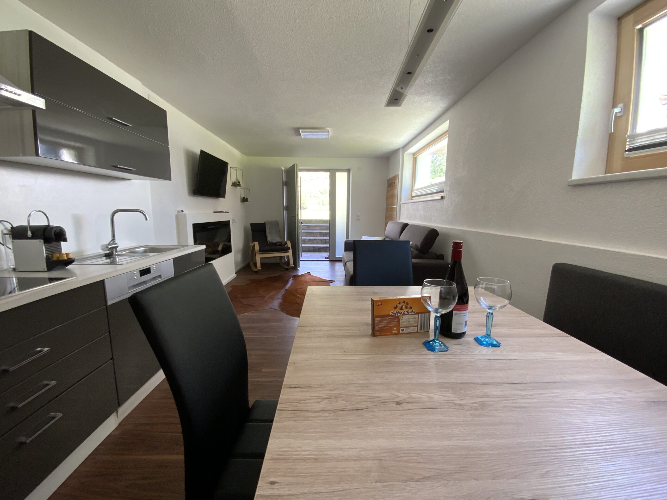 Freu dich auf einen hellen, offenen Wohn- und Essbereich. Eine voll ausgestattete Küche, ein Esstisch, eine gemütliche Couch und ein Elektrokamin schaffen den perfekten Rahmen für entspannte Stunden – ob beim Essen, Plaudern oder Abschalten.